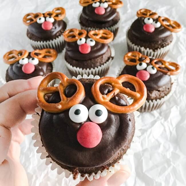 Gdy każda muffinka ma kopułkę od razu układamy na nich po dwa precelki, oczy i nos - lekko zagłębiając je w czekoladowym ganache. Gotowe renifery wstawiamy do lodówki na godzinę, żeby ganache stwardniał.