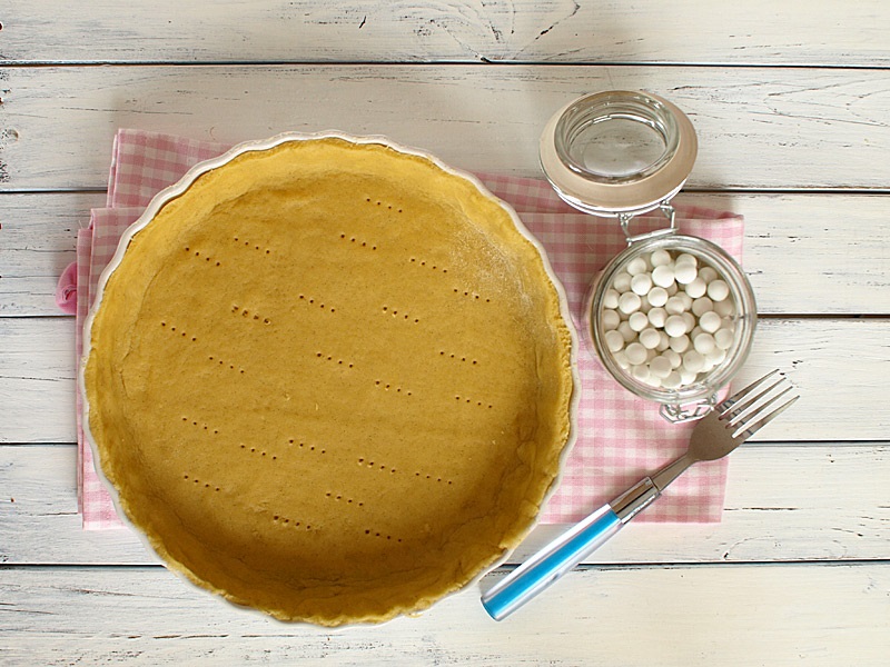 Ciasto w formie nakłuwamy kilka razy widelcem, pokrywamy papierem do piecznie i wysypujemy