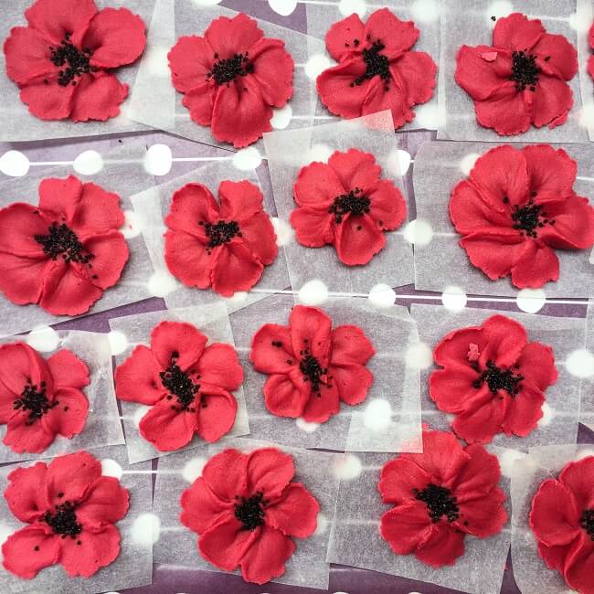 Dzień wcześniej przygotowałam czerwone maki z lukru królewskiego, które będą dopełnieniem dekoracji. To idealny sposób by zatuszować "kremowe niedociągnięcia" rozetek.