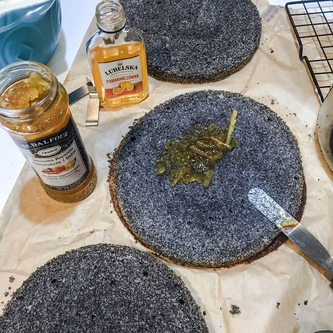 Biszkopt makowy kroimy na trzy blaty. Pierwszy nasączamy pomarańczówką, nakładamy warstwę konfitur – ja zużyłam pół słoiczka na jeden blat – nakładamy połowę kremu mascarpone, przykrywamy drugim blatem. Ze środkowym blatem postępujemy tak samo i przykrywamy trzecim.